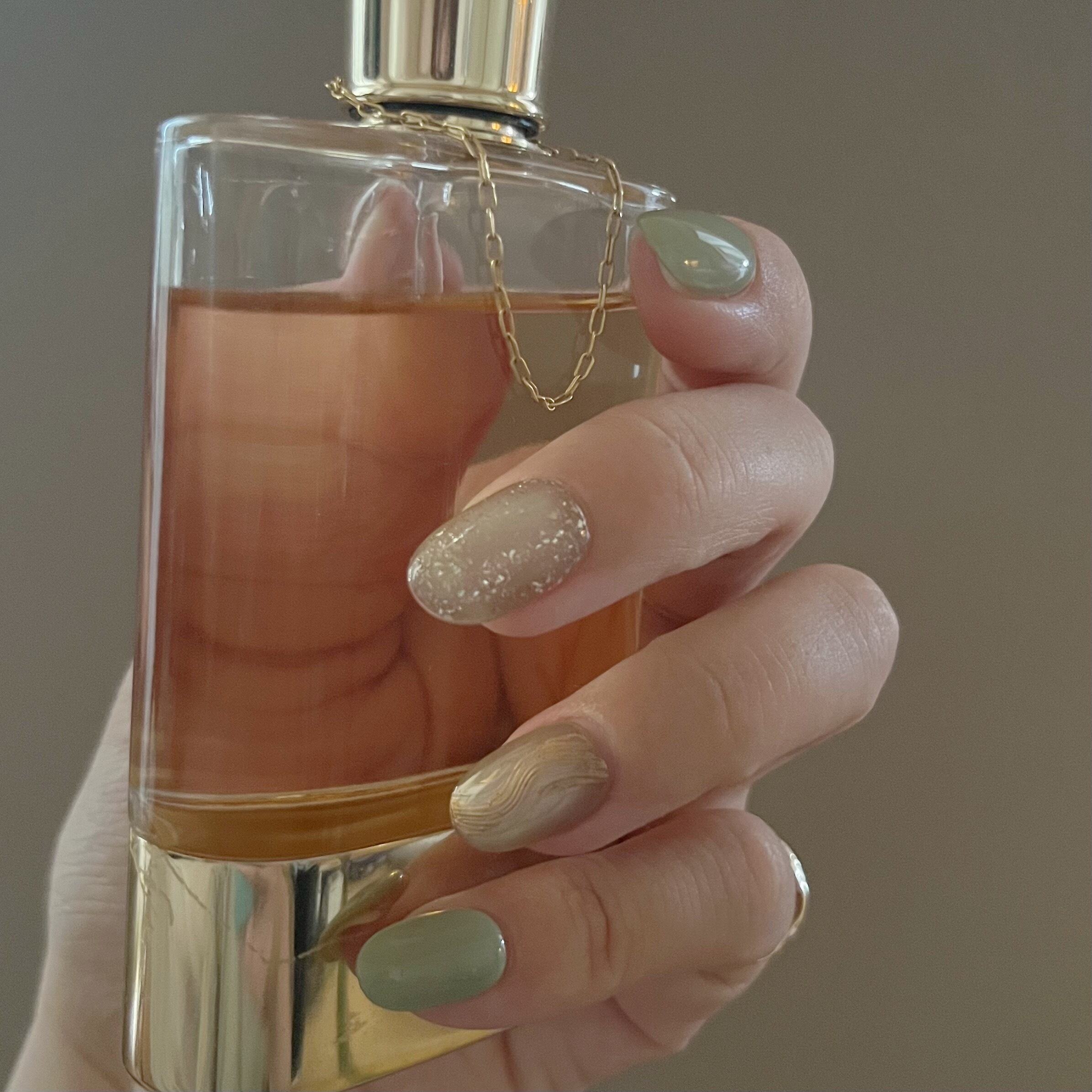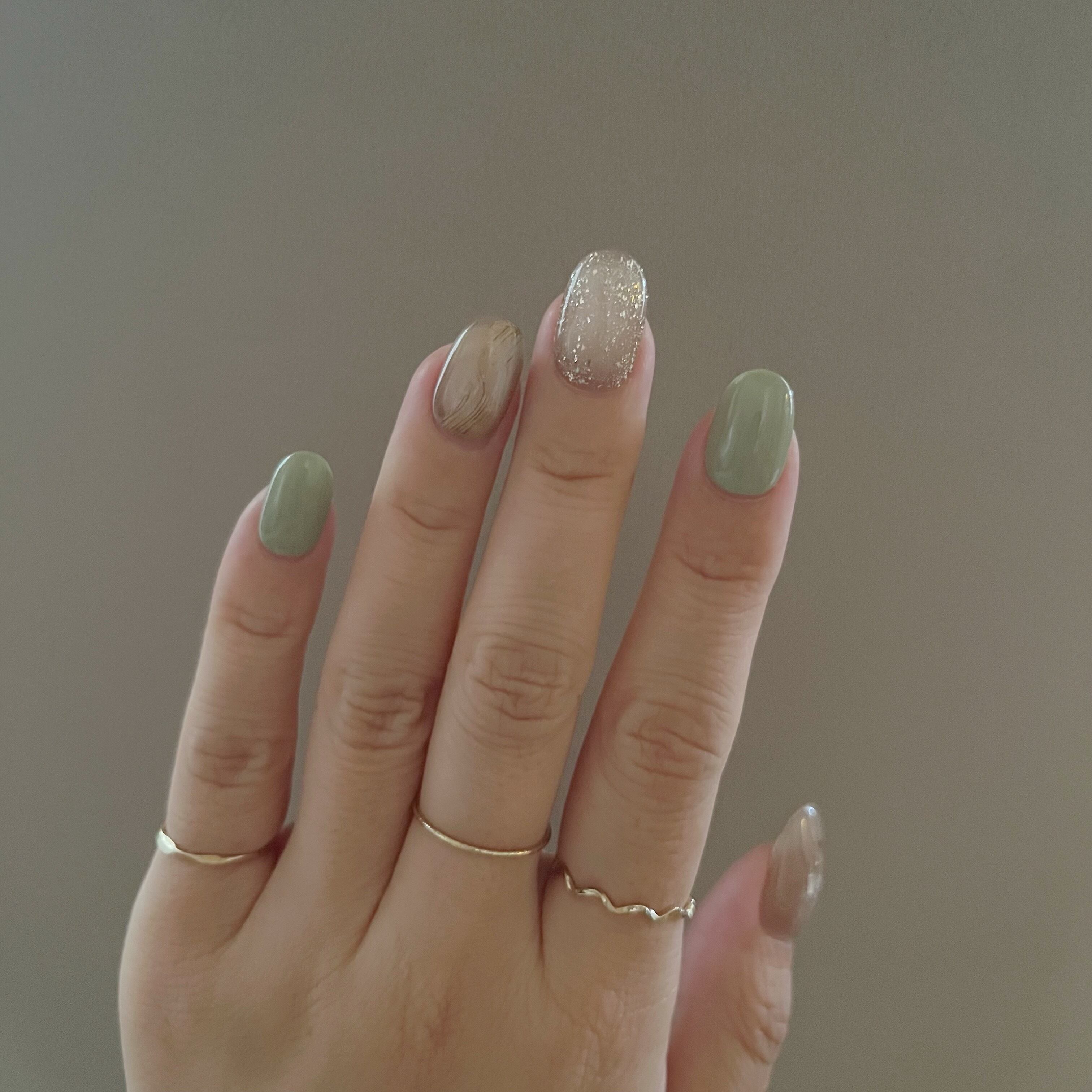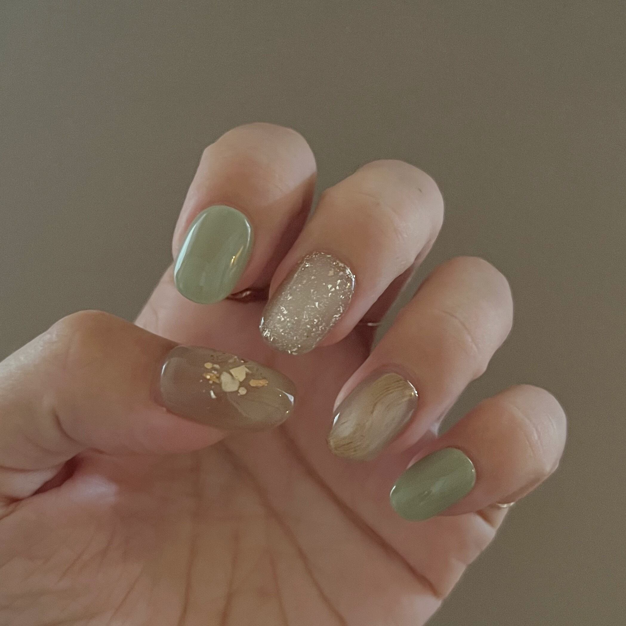 落ち着いたくすみグリーンとベージュにゴールドを合わせた、大人上品なニュアンスネイルです。