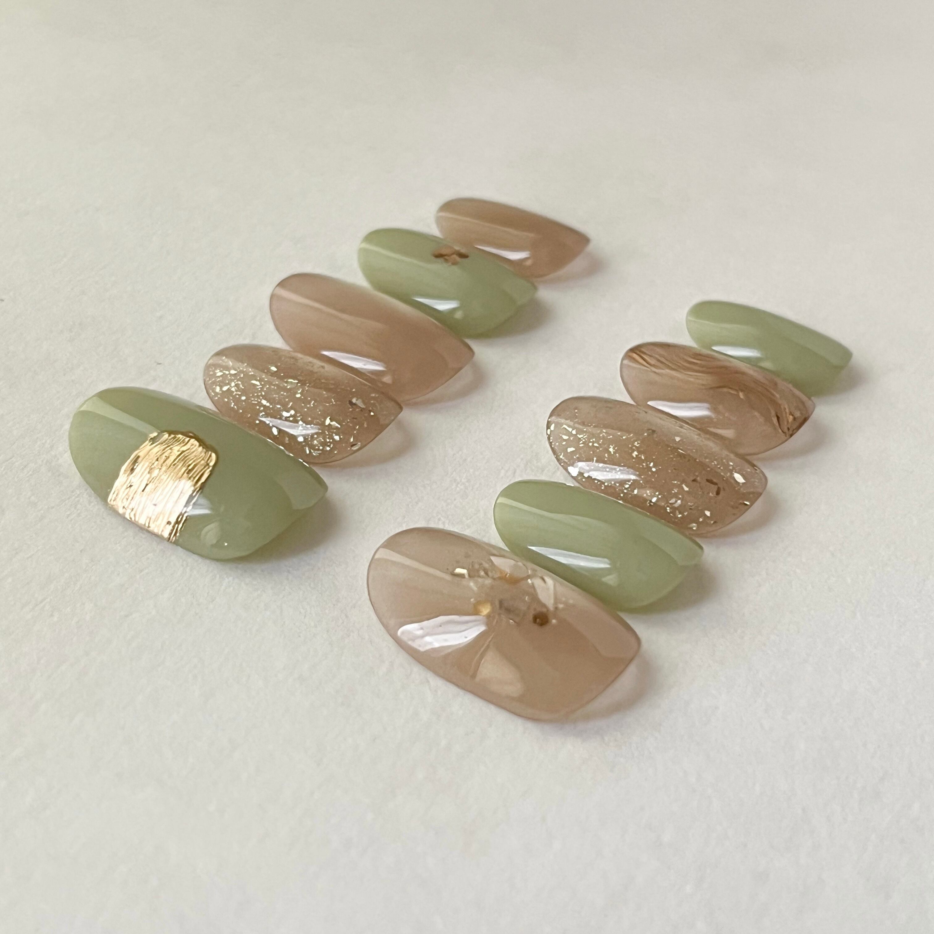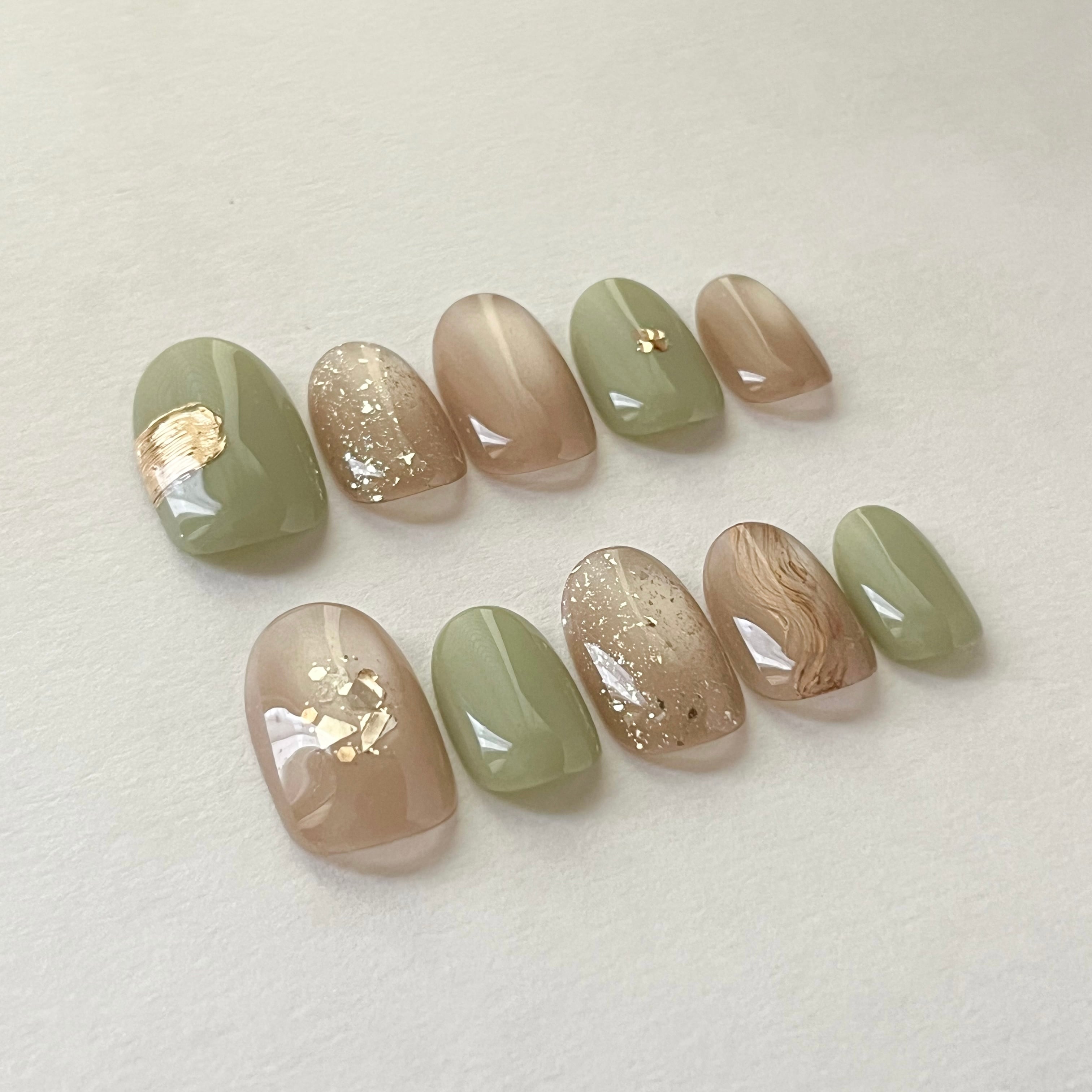 くすみグリーン×ベージュ 大人ニュアンスネイルチップ|秋冬オールシーズン