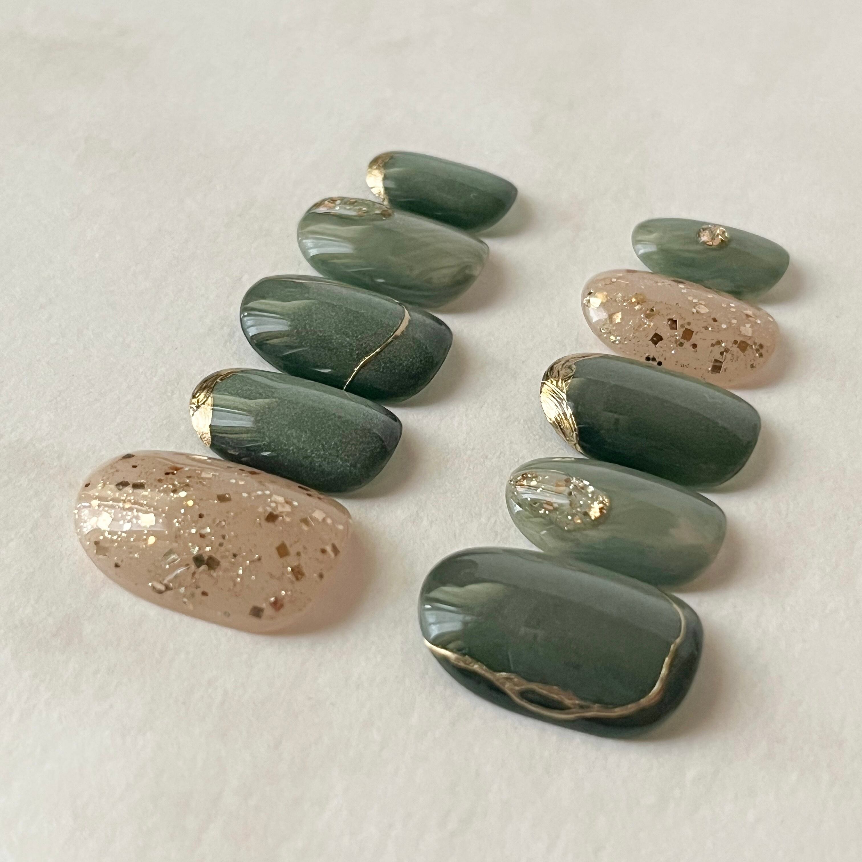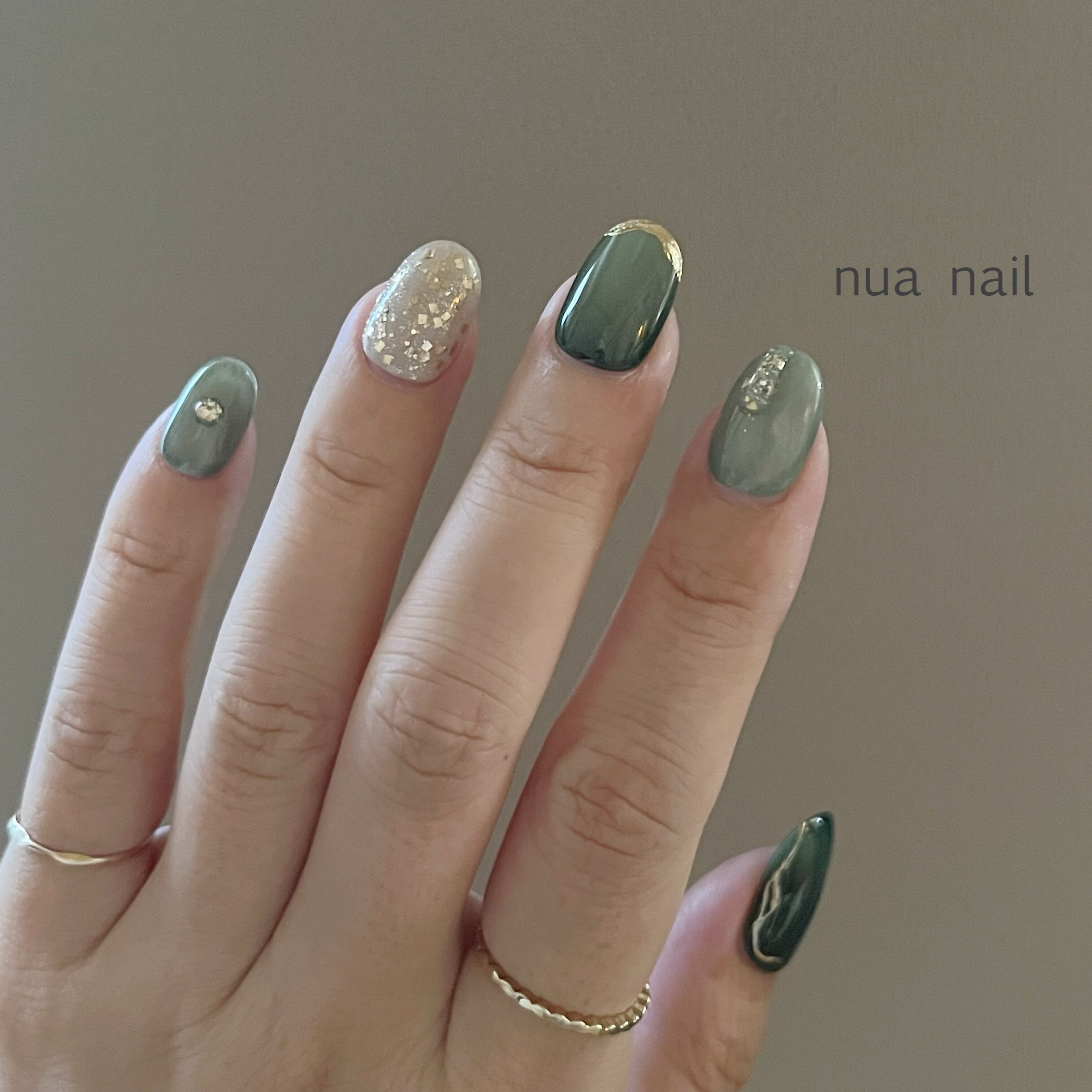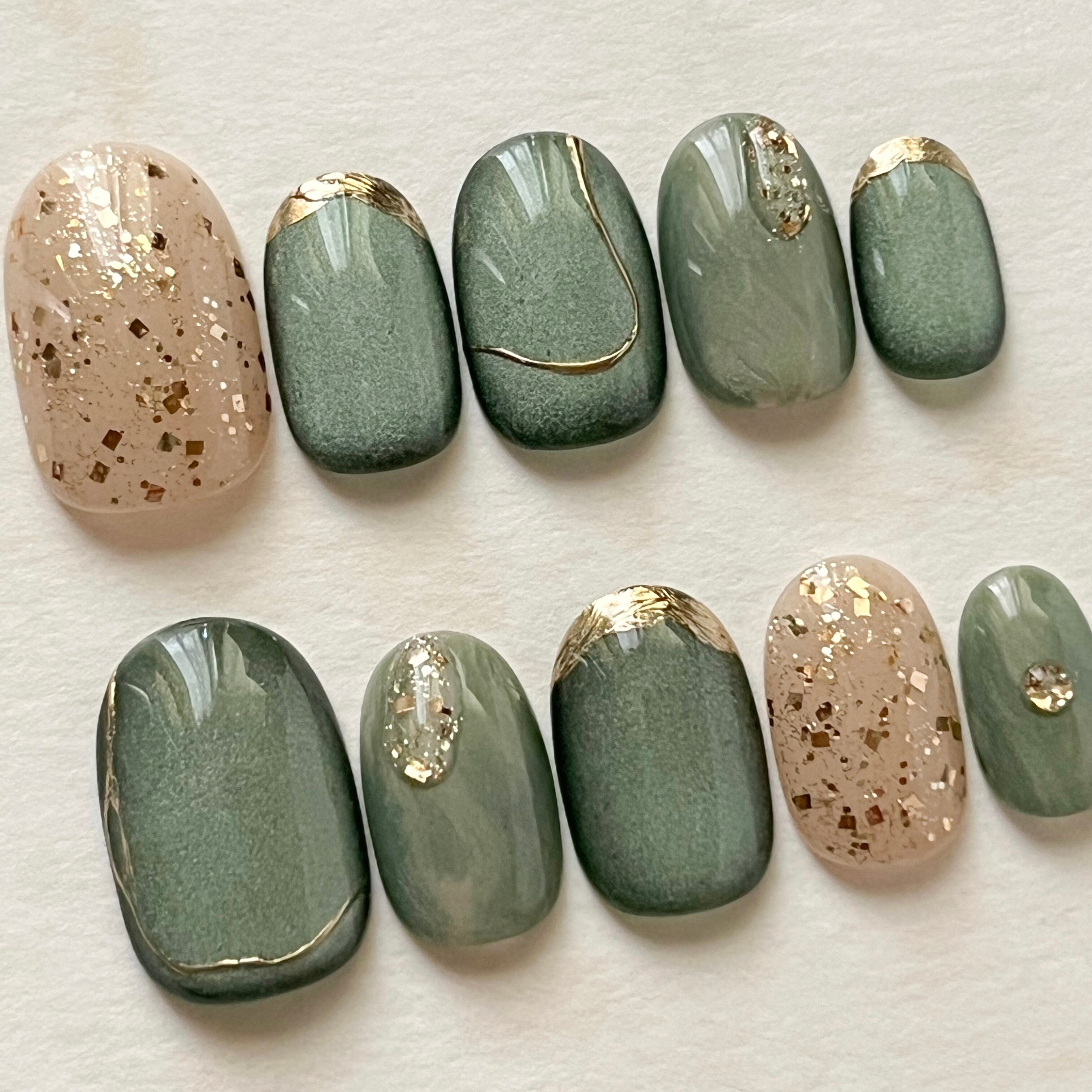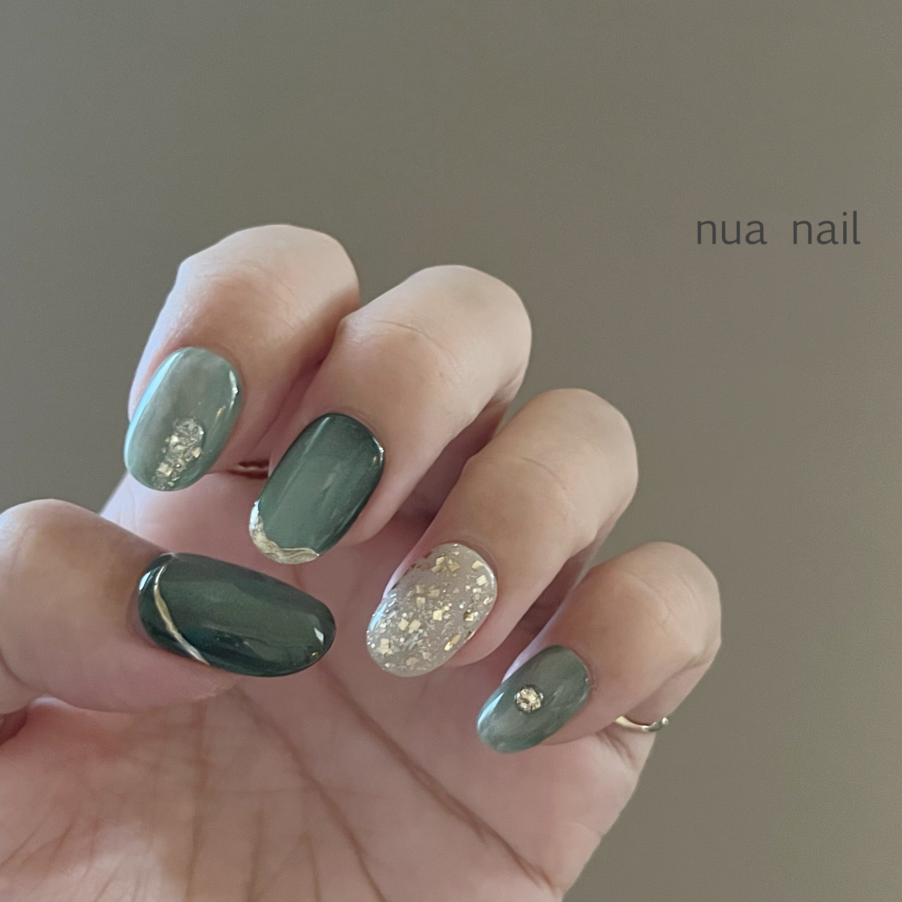 深みのあるグリーンのマグネットネイルに、ゴールドを散りばめた大人のトレンドネイル。