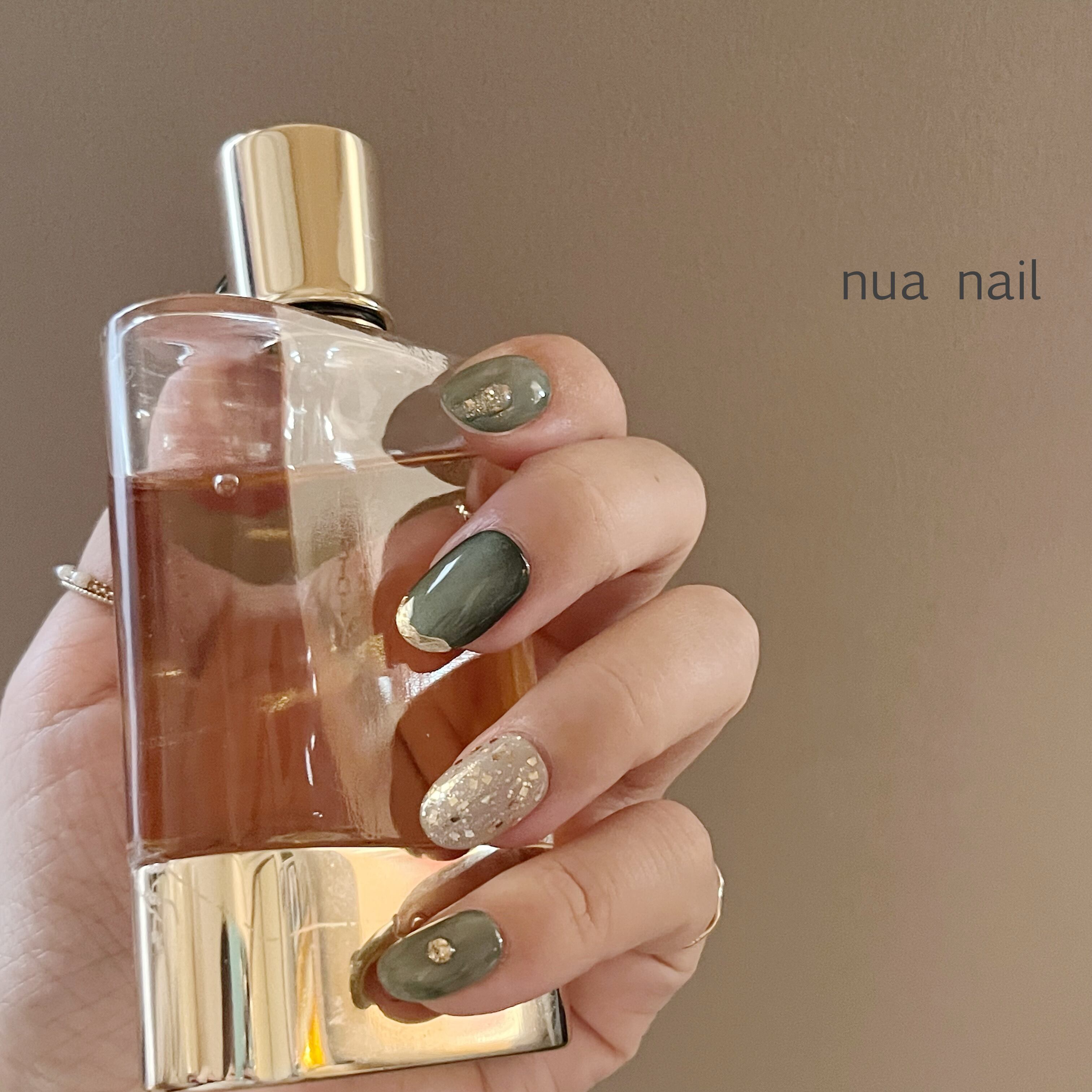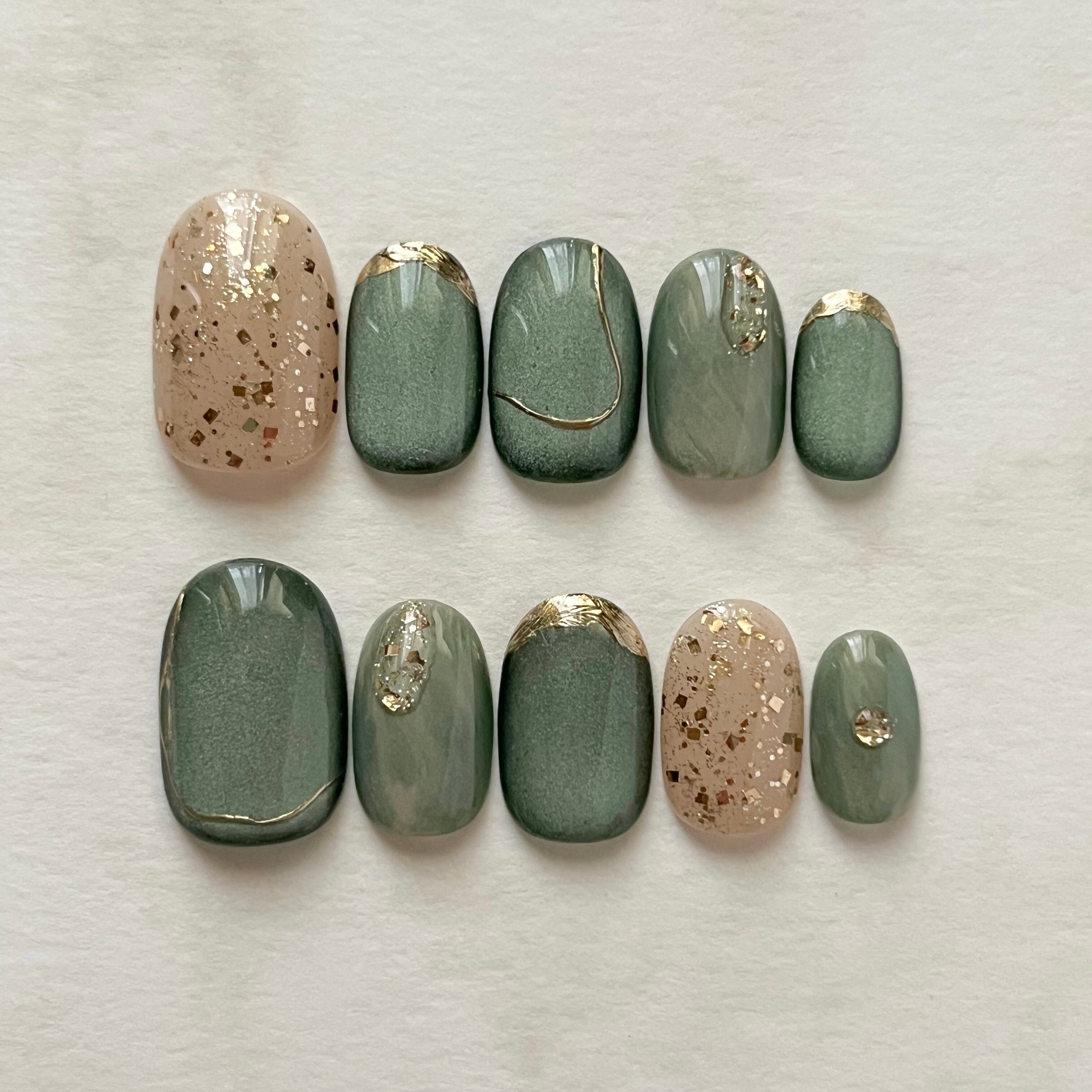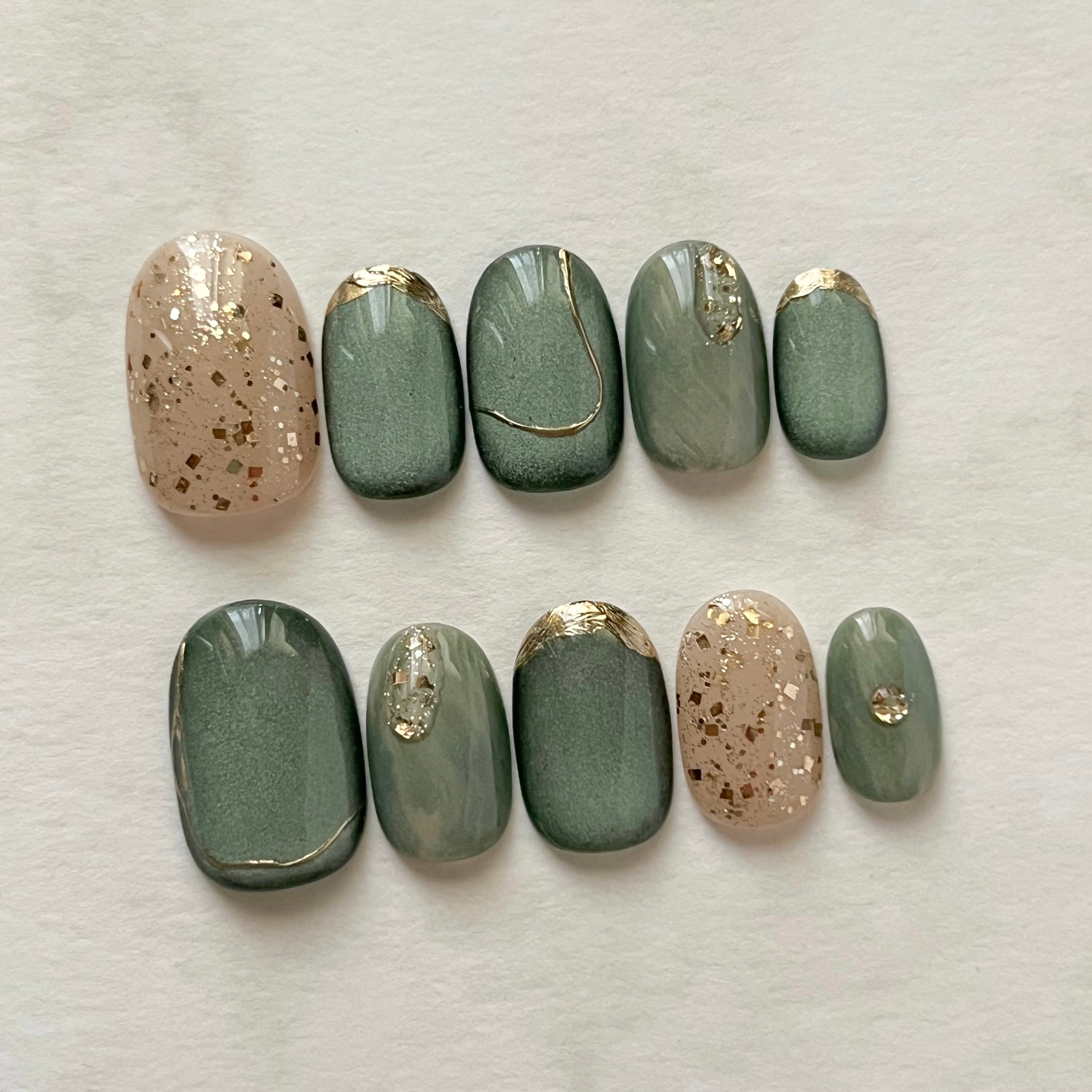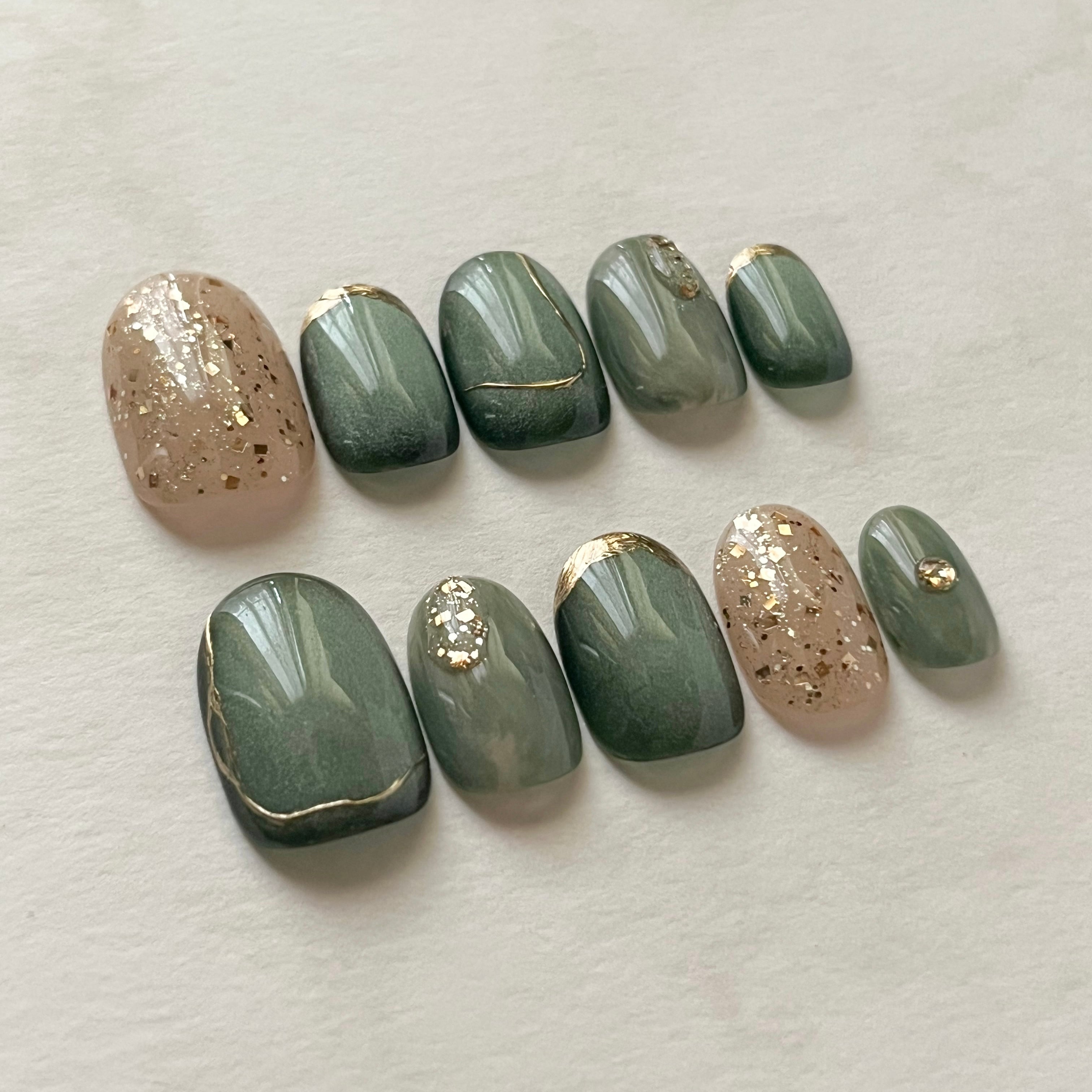 深みのあるグリーンのマグネットネイルに、ゴールドを散りばめた大人のトレンドネイル。